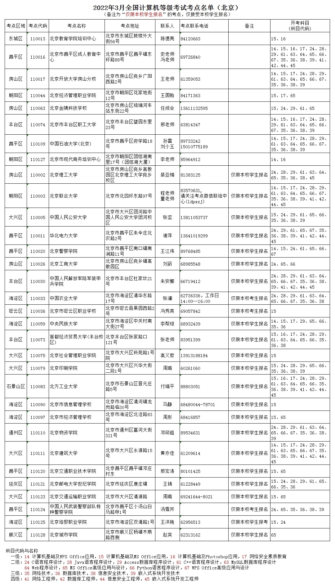 2022年3月NCRE考點名單(北京)
