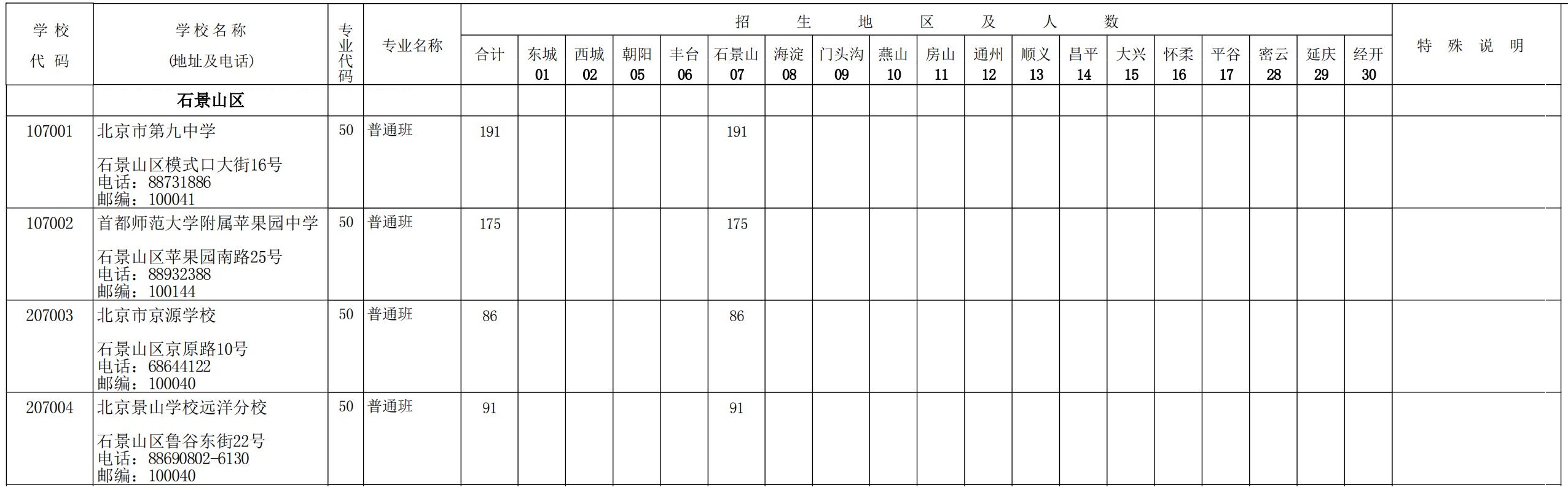 1.簡章第45頁:北京市第九中學(學校代碼:107001)、北京市京源學校(學校代碼:207003)、北京景山學校遠洋分校(學校代碼:207004)各增加1個招生計劃,首都師范大學附屬蘋果園中學(學校代碼:107002)增加3個招生計劃。如下表所示: